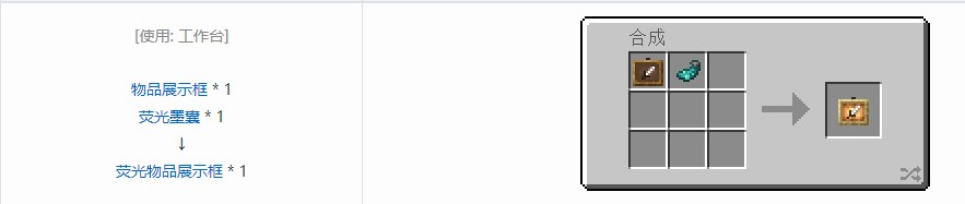 用途:与普通物品展示框不同之处在于,放入其内的物品可以在黑暗中发光。此类发光为实体渲染,不能照亮周围环境。