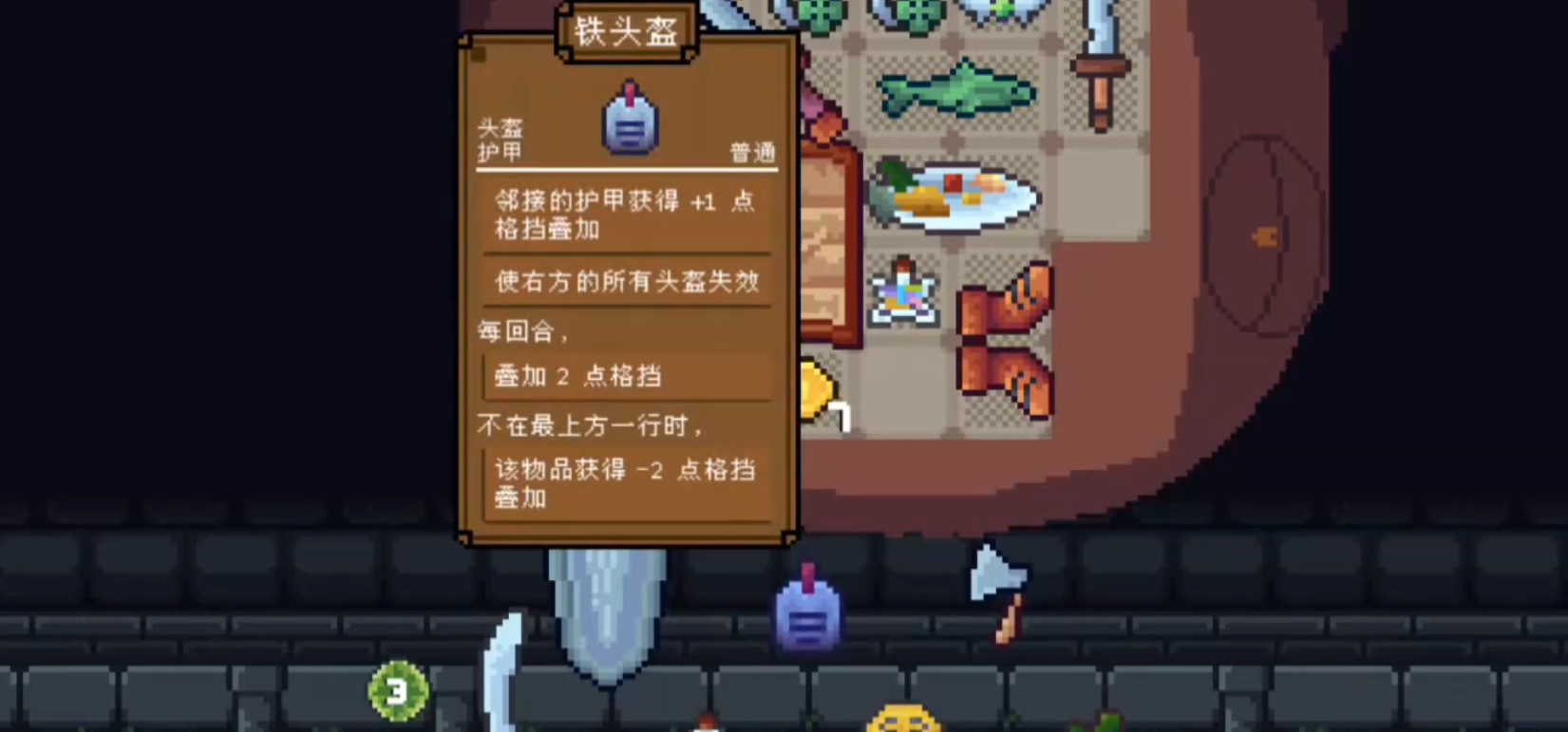 在游戏前期,优先选择具备防御能力的装备能有效提高生存率。铁头盔是初期较为实用的选择之一,其使用方式为将其置于护甲相邻的位置,即可获得1点格挡值加成。此外,该装备还能使位于其右侧的所有头盔类物品失效,每回合稳定提供2点格挡效果。若条件允许,可升级为带刺头盔,除具备相同的失效机制外,还可叠加4点刺甲属性,进一步增强反伤能力。