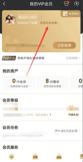 进入爱奇艺我的VIP会员界面后,直接点击下面的【管理自动续费】,如下图所示。