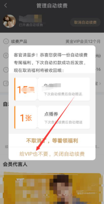然后在直接点击【给VIP也不要,关闭自动续费】,如下图所示。