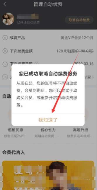 点击后爱奇艺弹出您已成功取消自动续费服务,直接点击我知道了,如下图所示。