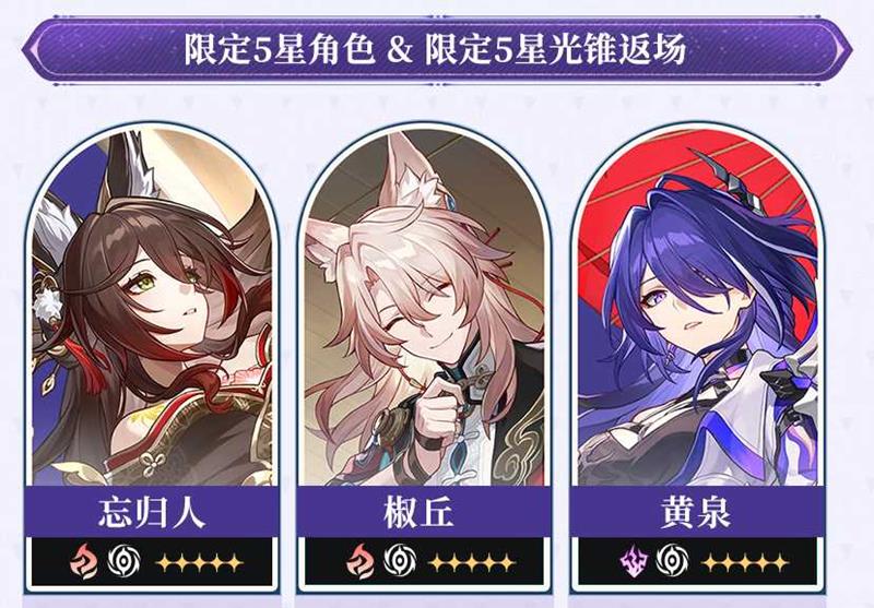 卡池2「铭心之萃丨&「真意之汇」:【角色池】忘归人、椒丘、黄泉;【光锥池】长路终有归途、那无数个春天、行于流逝的岸