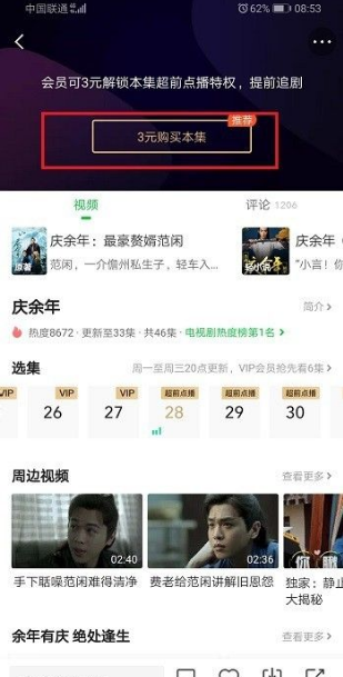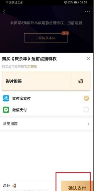 第四步点击爱奇艺的超前点播,看到需要支付3元才能看这一集,如下图所示: