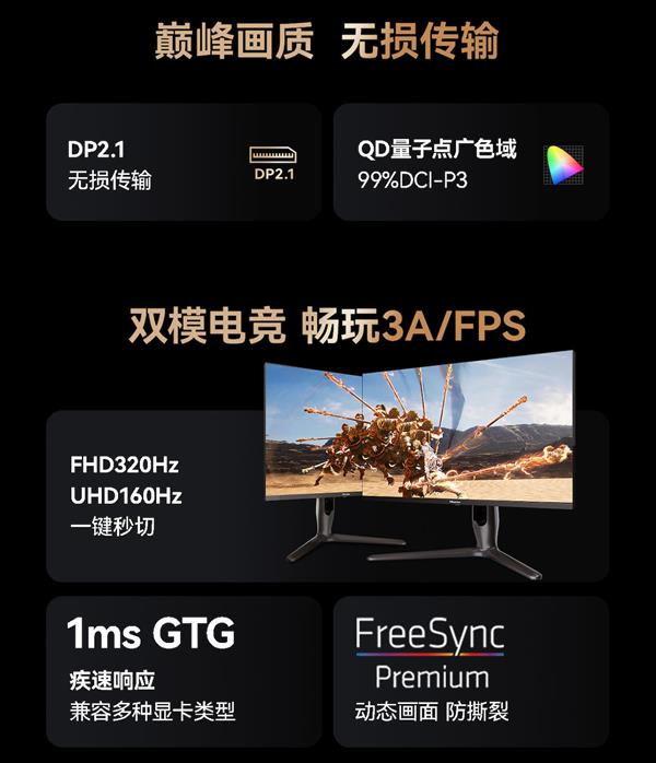 为了确保卓越画质的无损传输,海信G7 Ultra显示屏的接口升级到了满血版的DP 2.1,高带宽支持更高的分辨率和刷新率,充分释放4K 160Hz的显示性能,并可在UHD@160Hz和FHD@320Hz双模之间切换,一机满足3A游戏与FPS游戏的显示需求。考虑3A游戏剧情的丰富性,G7 Ultra全程使用DC调光0频闪,加上莱茵认证的低蓝光护眼技术,为玩家提供全天候的舒适视觉体验。