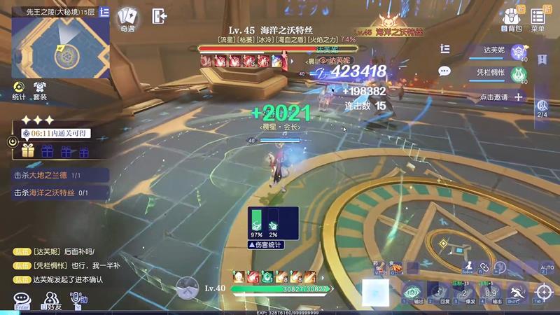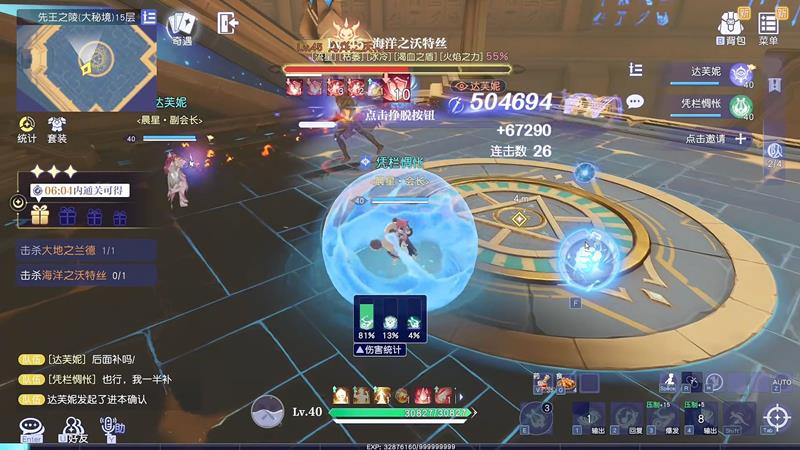老三:海洋之沃特丝海洋之沃特丝的技能释放顺序较为固定,首先是脚下红圈,随后是点名水牢循环,战斗进行一段时间后会释放水龙卷,水龙卷会减速冒险者,建议保持距离。在低层挑战时,这个BOSS相对容易应对,但在高层(如13至15层)或者低配队伍挑战9至12层时,需要注意点名水牢。