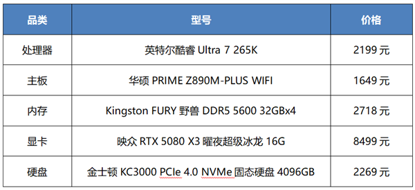 英特尔酷睿Ultra 7 265K处理器拥有8大核12小核20线程,大核频率3.9-5.5GHz,小核频率3.3-4.6GHz,二级缓存36MB,三级缓存30MB。主板选择了华硕PRIME Z890M-PLUS WIFI,这款主板采用10+1+2+1供电模组,支持最大192GB DDR5内存,甚至可以支持8400+MT/s速度内存,3组M.2插槽,其中1组还支持PCIe 5.0x4模式,未来升级无忧!