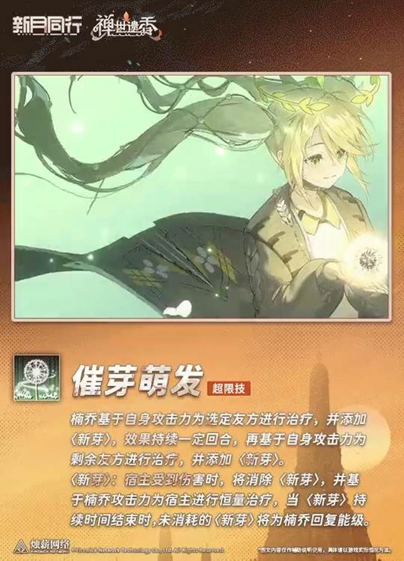 【催芽萌发】 超限技 楠乔基于自身攻击力为选定友方进行治疗,并添加〈新芽〉,效果持续一定回合,再基于自身攻击力为剩余友方进行治疗,并添加〈新芽〉。 〈新芽〉:宿主受到伤害时,将消除〈新芽〉,并基于楠乔攻击力为宿主进行恒量治疗,当〈新芽〉持续时间结束时,未消耗的〈新芽〉将为楠乔回复能级。