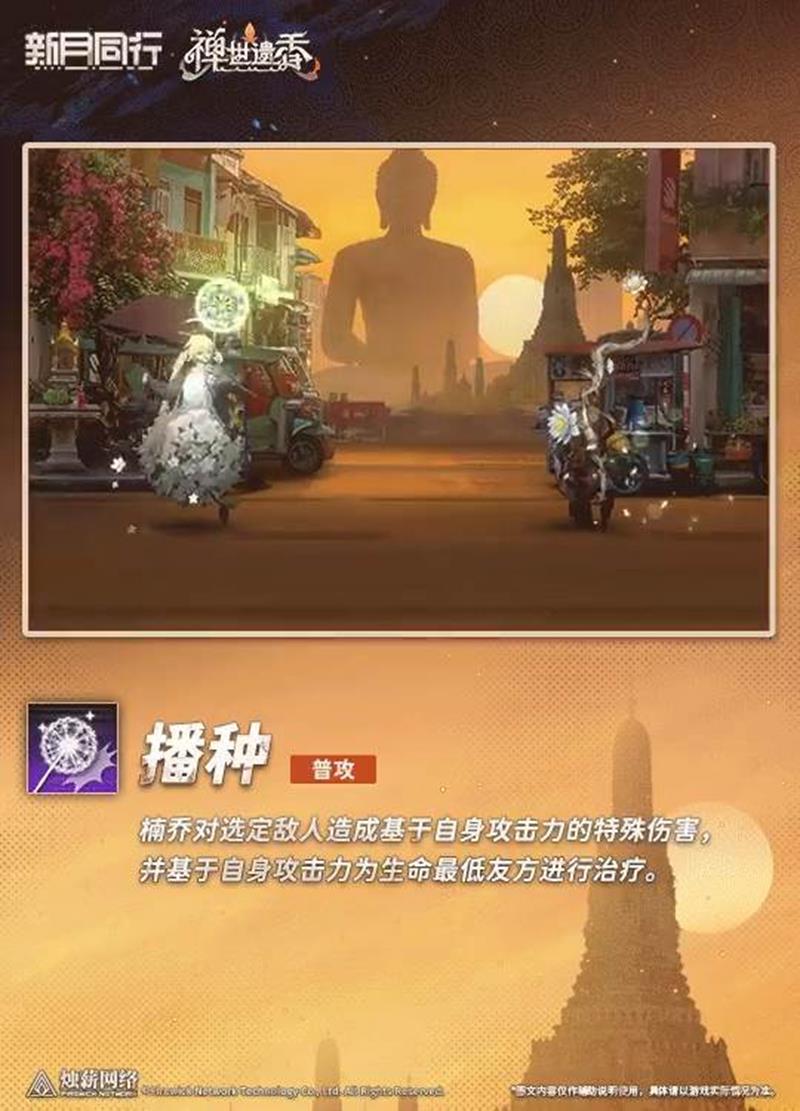 【播种】 普攻 楠乔对选定敌人造成基于自身攻击力的特殊伤害,并基于自身攻击力为生命最低友方进行治疗。