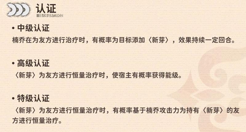 ·特级认证 〈新芽〉为友方进行恒量治疗时,有概率基于楠乔攻击力为持有〈新芽〉的友方进行恒量治疗。