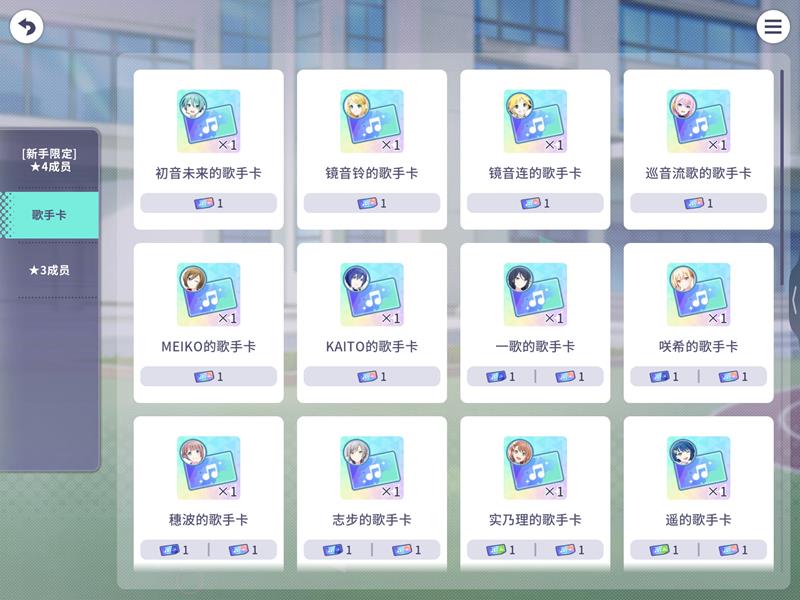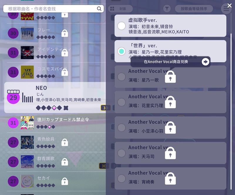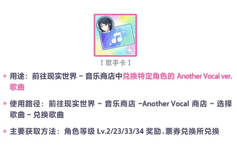 歌手卡可以在现实世界-音乐商店中兑换特定角色的Another Vocal版本的歌曲,可以解锁一首歌的另一种不同歌手版本;