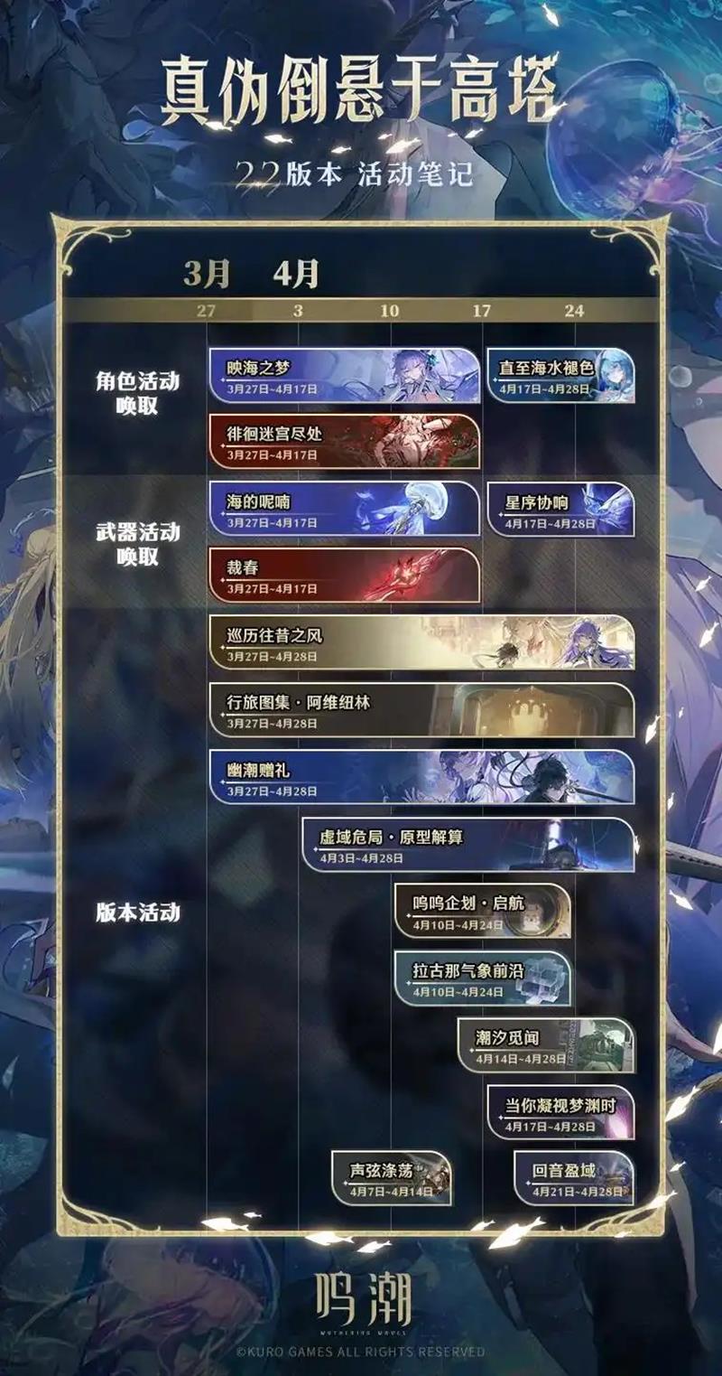 4月活动同样精彩纷呈,10日呜呜企划与拉古那气象前沿上线,完成呜呜企划可获400星声及5颗蓝球,拉古那气象前沿奖励为400星声及其他部分奖励。14日【潮汐觅闻】开启,17日、21日分别有【当你凝视梦渊时】、【回音盈域】活动。