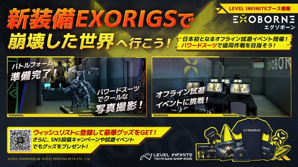 开放世界战术撤离射击游戏《EXOBORNE》展区将带来日本首次线下试玩!三人组队,共同探索近未来世界,对抗自然的极端力量。另外Exo-Rigs的装置也落地现场,玩家可以在现场拍照打卡,体验外骨骼装甲的魅力。