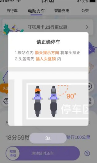 3、按住【滑动还车】按钮,弹出【请正确停车】提示框,根据提示完成操作,点击【立即还车】按钮即还车成功。