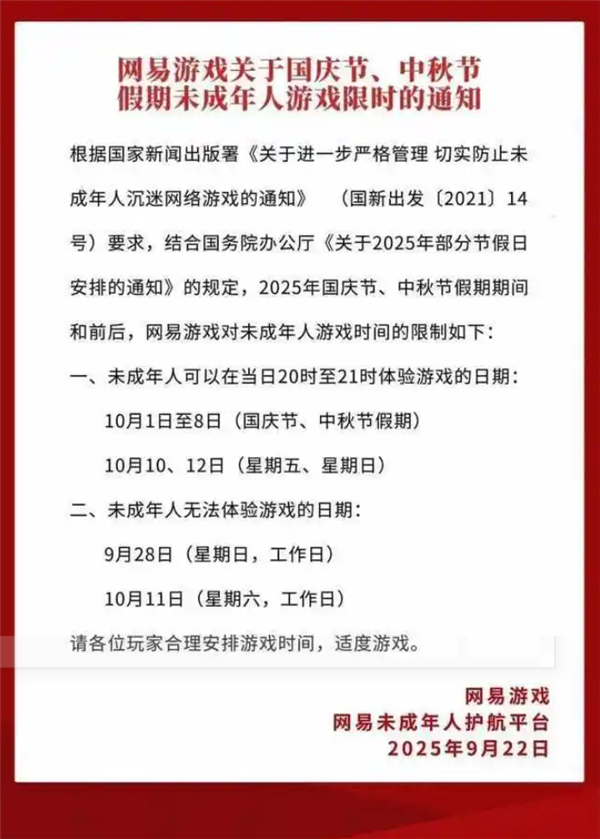 另外,网易游戏也发布《网易游戏关于国庆节、中秋节假期未成年人游戏限时的通知》。