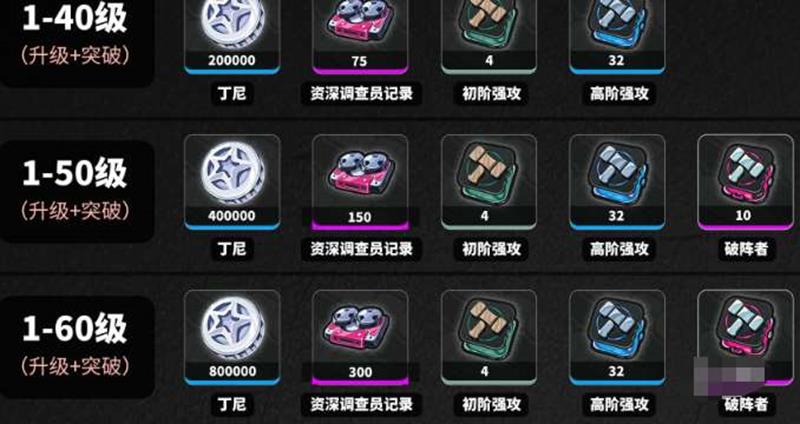40-50级:丁尼×400,000资深调查员记录×150初阶强攻认证章×4高阶强攻认证章×32破阵者认证章×10