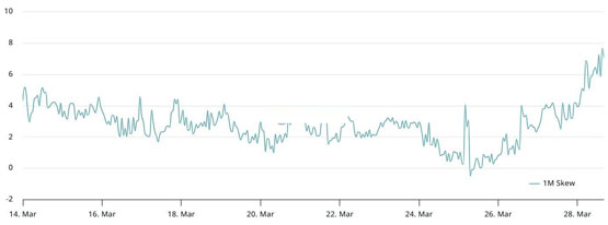 当交易者预期出现下降趋势时,25%的delta偏差指标会上升到6%以上,显示对冲策略的需求更高。相比之下,看涨时期通常会将偏差推低至-6%以下。而目前该指标落在7%,这表明专业交易员缺乏信心,从而增加了进一步看跌的可能性。