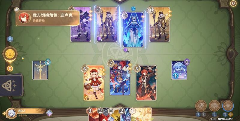 第二回合,可莉再次释放元素战技,不要普攻,将愚人众岩使游击兵的生命值压到4血,接着切莫娜释放元素战技,快切迪卢克。回合结束,依然保持我方先手。