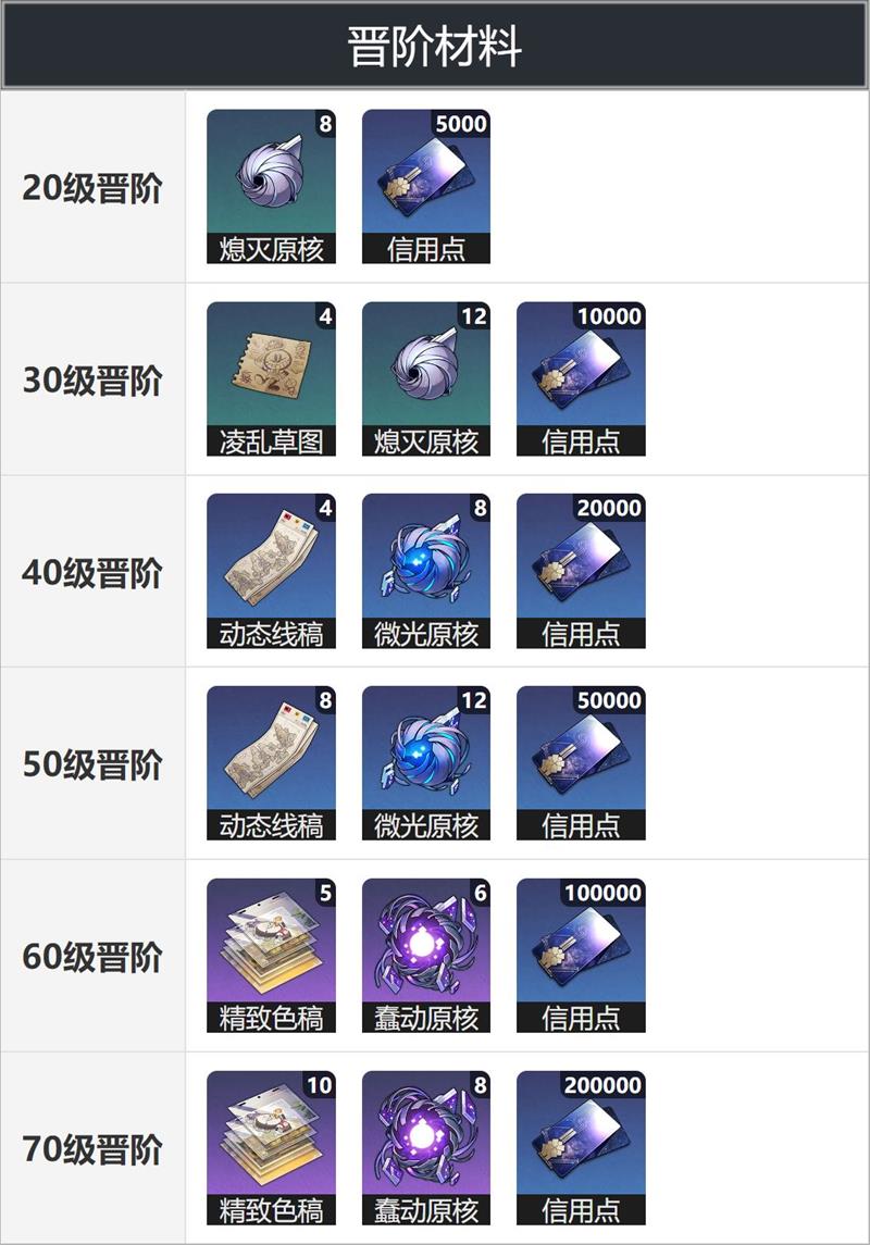 70级晋阶:精致色稿10、蠢动原核8、信用点200000