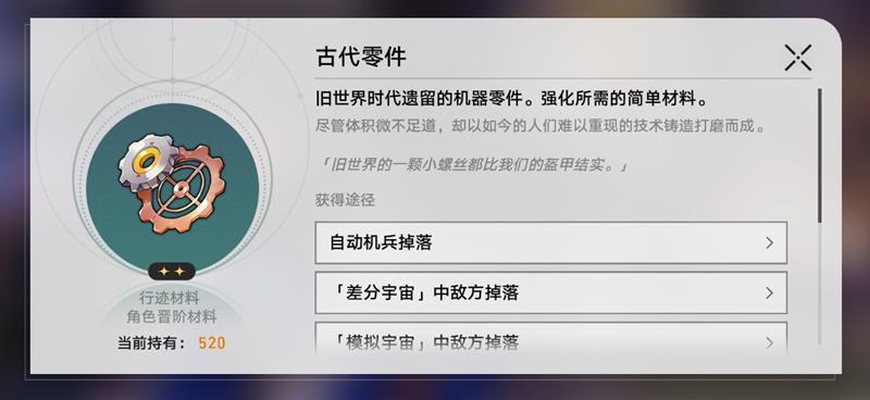 古代零件可以用于角色行迹升级