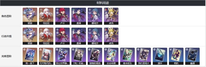 银狼、克拉拉、卢卡、桑博、娜塔莎、虎克等角色行迹升级、晋阶都需要消耗古代零件。