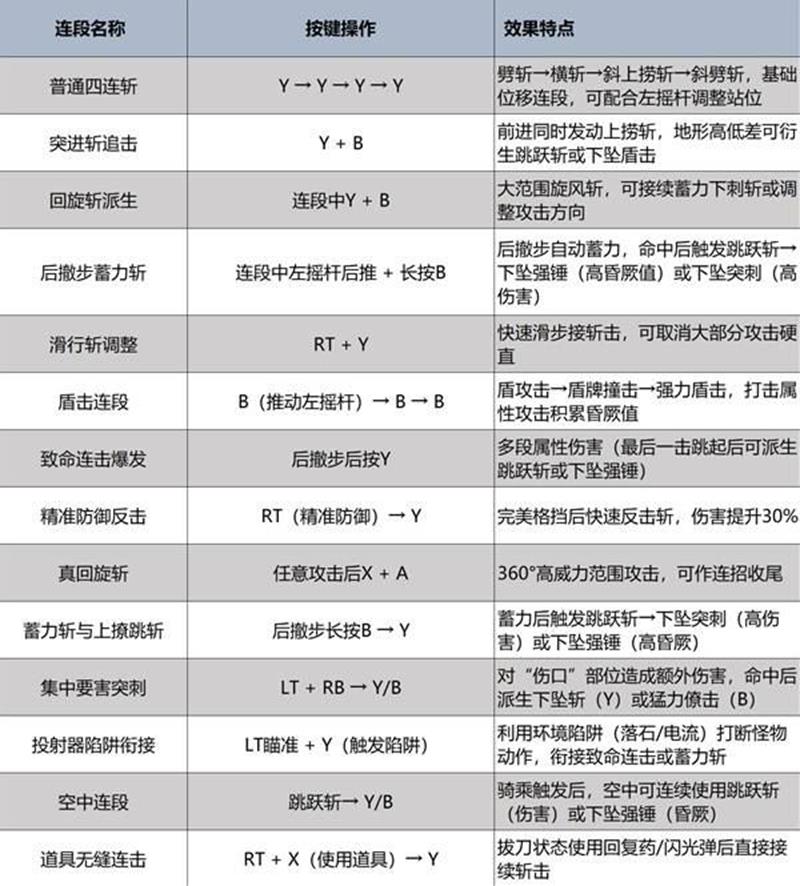 基础连段(斩击→盾击→回旋斩)兼具伤害与位移,可快速调整站位躲避怪物范围攻击。