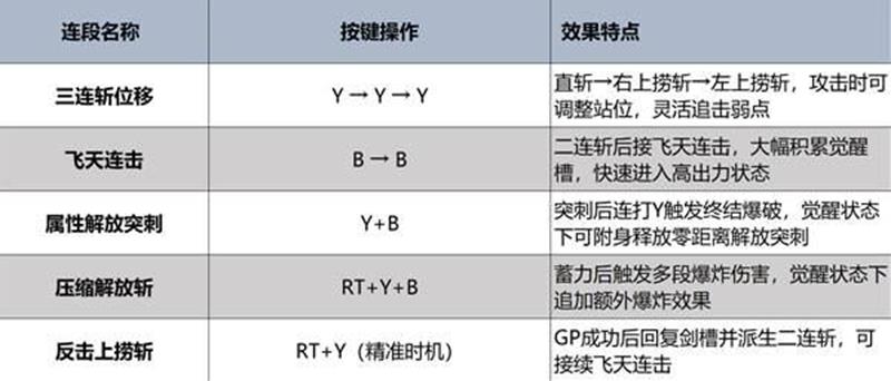 GP技(反击上扬斩)?成功触发可回复斩击槽并派生二连斩,兼具资源管理与爆发。