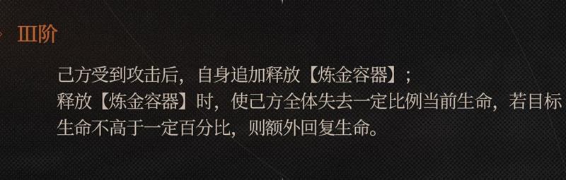III阶 己方受到攻击后,自身追加释放【炼金容器】; 释放【炼金容器】时,使己方全体失去一定比例当前生命,若目标生命不高于一定百分比,则额外回复生命。