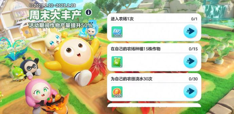 从活动开始,2月22日(周六)0点-23日23点59分,时间段内成熟的作物都将增产50%。如作物是丰收或大丰收状态,50%增产效果也将叠加生效。