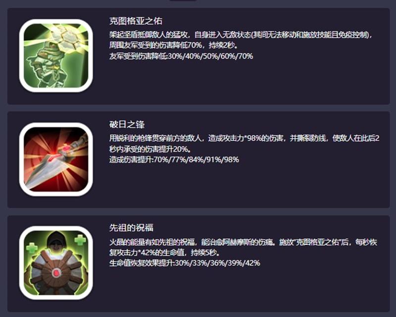 【先祖的祝福】火晶的能量有如先祖的祝福,能治愈阿赫摩斯的伤痛。施放“克图格亚之佑”后,每秒恢复攻击力*42%的生命值,持续5秒。生命值恢复效果提升:30%/33%/36%/39%/42%