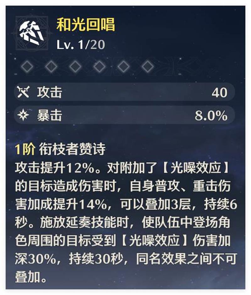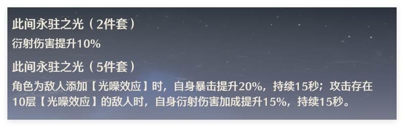 在输出形态中,推荐菲比采用套装“此间永驻之光”。同时cost4选择梦魇·哀声鸷,根据菲比使用武器选择使用暴击率或爆伤,如果使用武器为“和光回唱”和“掣傀之手”选择爆伤,如果使用武器为“琼枝冰绡”,则选择暴击率。
