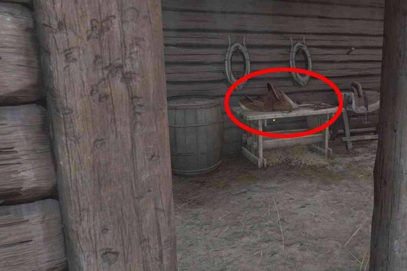 调换文件:下楼到达庭院,进入马厩后方的门,找到阿尔德的马鞍,瞄准马鞍并按住×/A键调换文件。