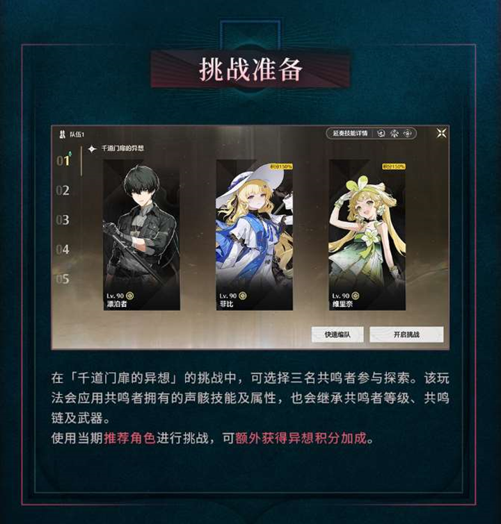 在挑战前,玩家可以从自己的共鸣者中挑选三名参与探索。这些角色的声骸技能、属性以及等级、共鸣链和武器都会影响到挑战的效果。使用当期推荐的角色进行挑战,还能额外获得异想积分加成。