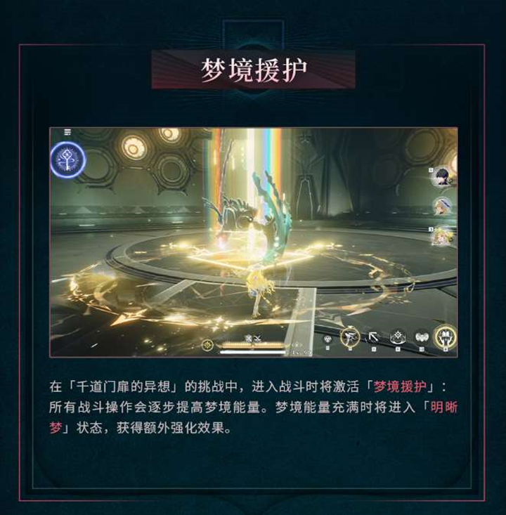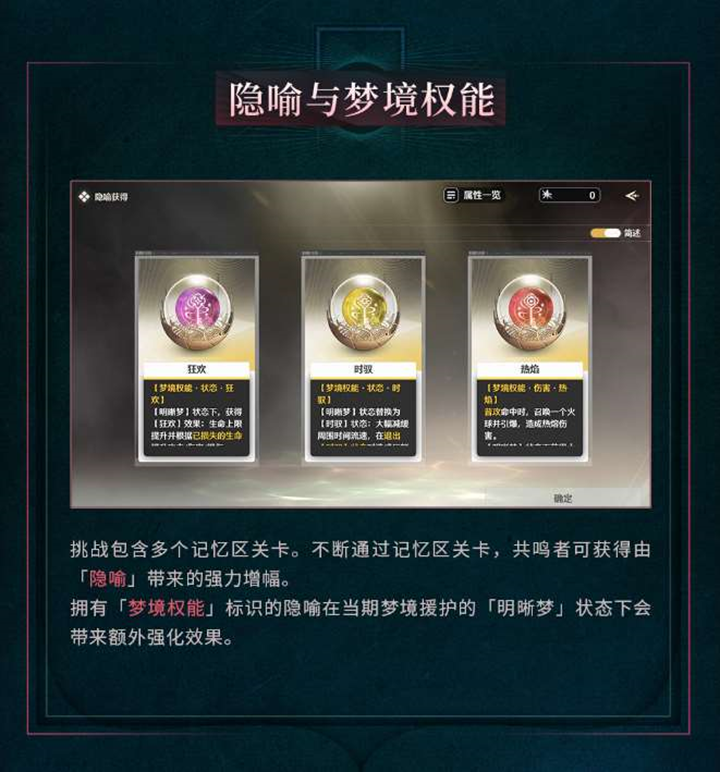 进入战斗后,“梦境援护”机制将被激活,随着战斗操作积累梦境能量。当梦境能量充满时,玩家将进入“明晰梦”状态,享受额外的强化效果。“隐喻”则能为共鸣者带来强力增幅,在“明晰梦”状态下,带有“梦境权能”的隐喻将提供更强大的增益。
