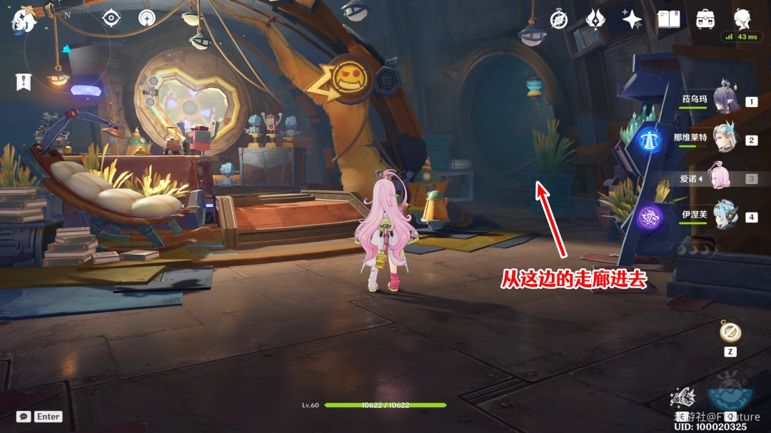 前往伦波岛「叮铃哐啷蛋卷工坊」图示位置,从这里进入爱诺的家。