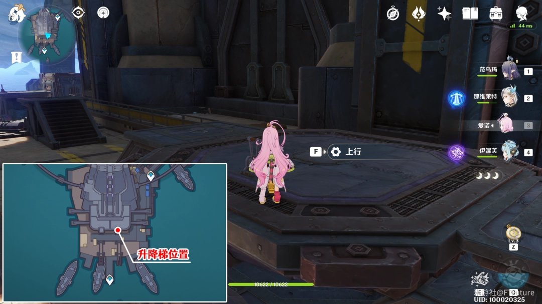 前往帕哈岛「月矩力试验设计局」南边图示位置,搭乘这里的升降梯前往上层平台。