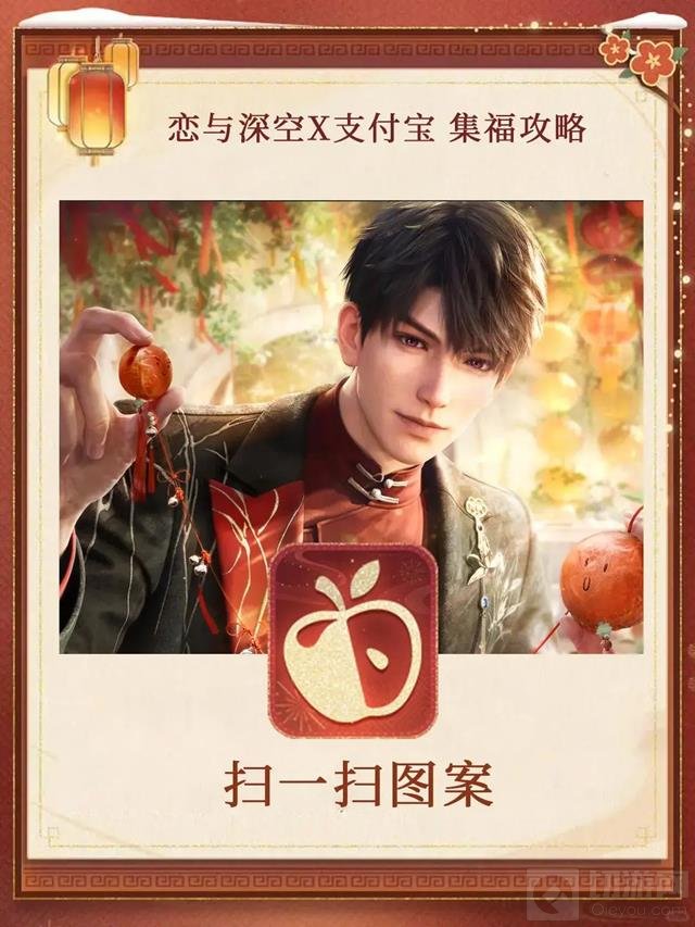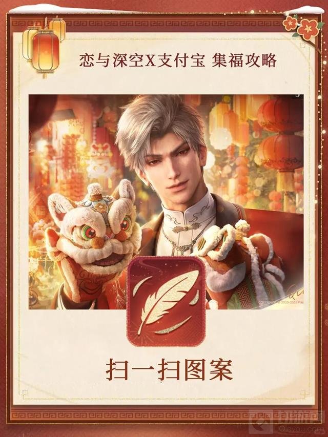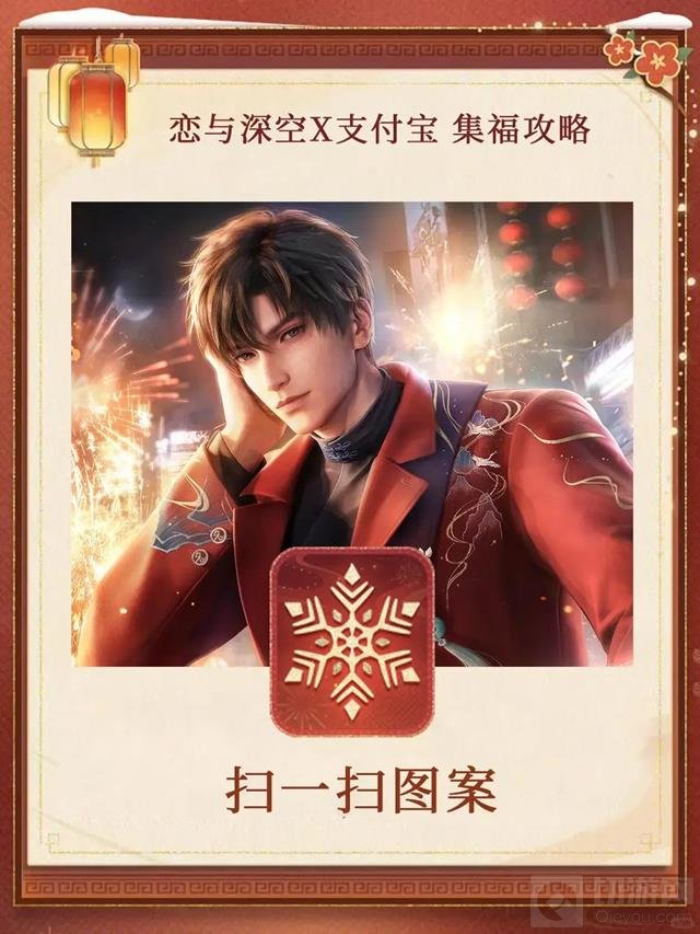 同时恋与深空的支付宝扫福卡活动也开启了。打开支付宝APP,集福卡页面选择深空主题,扫一下下面这几张图,集深空五福,获得福卡后记得翻页。