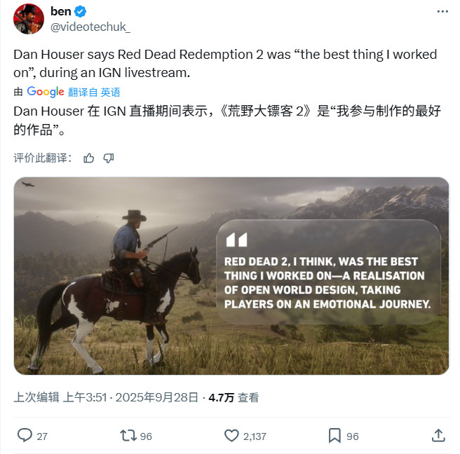 时间:2025-09-29 | 作者: | 阅读:0R星联合创始人Dan Houser近日在LA漫展上接受了IGN的专访,他承认《荒野大镖客2》是其开发过的最好的游戏。相信很多粉丝也同意这种观点,时至今日,《荒野大镖客2》仍被公认是最好的开放世界故事驱动游戏。