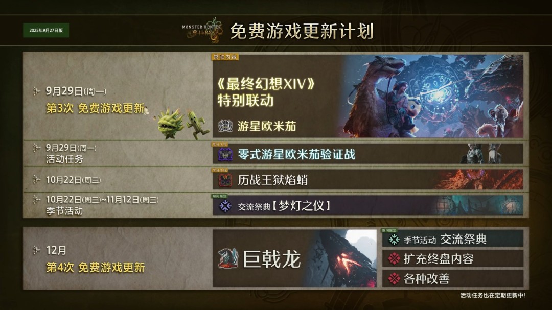 时间:2025-09-29 | 作者: | 阅读:0近日,卡普空发布了《怪物猎人:荒野》×《最终幻想XIV》特别联动中的超高难度活动任务“零式游星欧米茄验证战”介绍视频,本次联动将于今日发布的第3次游戏更新中正式上线。同时直至12月的免费更新计划现已放出,一起来看看吧!