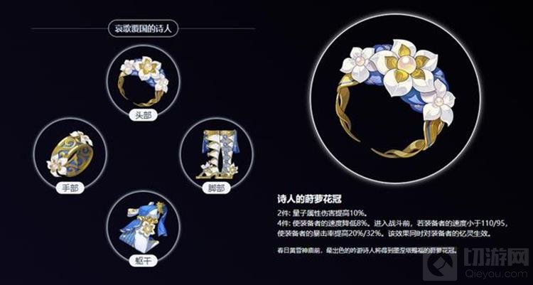 再来看“哀歌覆国的诗人”套装。2件套效果为量子属性伤害提高10%,而4件套效果则更为出色。装备者的速度降低8%,但如果装备者的速度在进入战斗前小于110或95,那么装备者的暴击率将提高20%或32%,这一效果同样适用于装备者的忆灵。值得注意的是,这一速度条件的设定意味着玩家在搭配这套遗器时,需要格外关注角色的初始速度,避免因速度过高而无法触发暴击率提升的效果。从泛用性角度来看,“哀歌覆国的诗人”套装适合云璃、青雀、刃等角色。