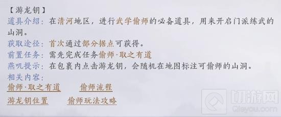 游龙钥:游龙钥是开启偷师山洞的钥匙道具,具有唯一性和消耗性。获取游龙钥是偷师行动的关键一步,也是完成【如何偷师】任务的前提条件。