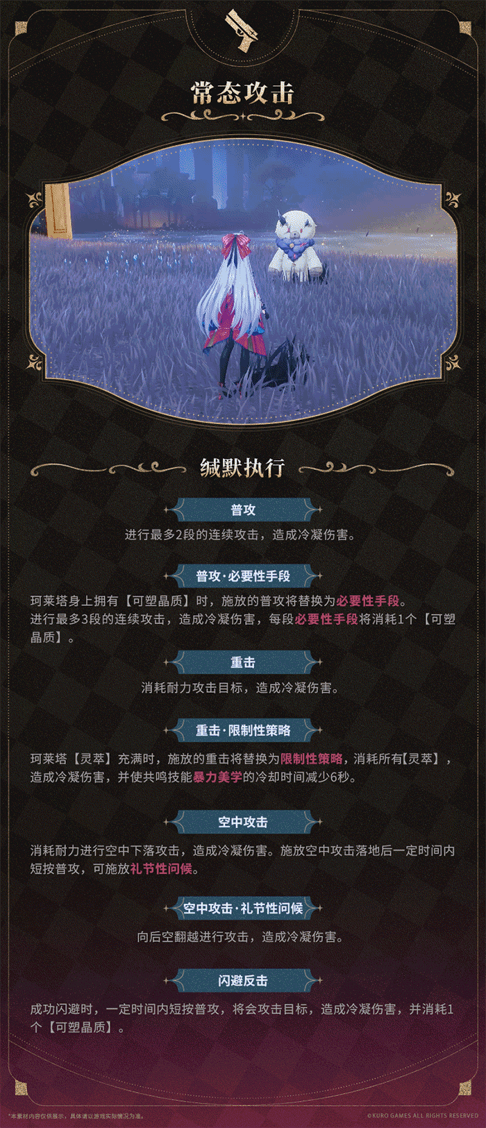 普攻进行最多2段的连续攻击,造成冷凝伤害。普攻·必要性手段珂莱塔身上拥有【可塑晶质】时,施放的普攻将替换为必要性手段。进行最多3段的连续攻击,造成冷凝伤害,每段必要性手段将消耗1个【可塑晶质】。重击消耗耐力攻击目标,造成冷凝伤害。重击·限制性策略珂莱塔【灵萃】充满时,施放的重击将替换为限制性策略,消耗所有【灵萃】,造成冷凝伤害,并使共鸣技能暴力美学的冷却时间减少6秒。空中攻击消耗耐力进行空中下落攻击,造成冷凝伤害。施放空中攻击落地后一定时间内短按普攻,可施放礼节性问候。空中攻击·礼节性问候向后空翻越进行攻击,造成冷凝伤害。闪避反击成功闪避时,一定时间内短按普攻,将会攻击目标,造成冷凝伤害,并消耗1个【可塑晶质】。