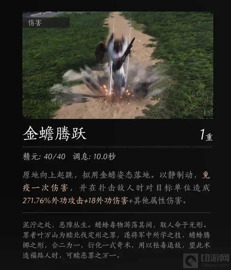 金蟾腾跃技能源自罪者叶万山,他为赎北伐定州之罪,将军队中的技巧与蟾蜍腾挪之形结合,创造出这式奇术,用以祛毒退敌。希望此术在造福路人的同时,也能赎回他的恶罪。