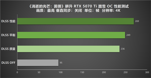 而最考验显卡性能的4K模式下,耕升GeForce RTX 5070 Ti 踏雪 OC 2.0显卡的表现依旧出色。在关闭DLSS时的95帧已能满足大部分玩家的流畅标准。开启NVIDIA DLSS 4后,帧数依然飙升,质量模式下的236帧能在保持4K极致画面细腻度的同时,还给玩家带来了极为流畅的战斗体验。平衡模式与性能模式则进一步释放性能,分别来到了249帧与269帧,玩家可根据实际体验选择在最适合自己的模式下畅玩4K。