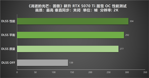 进入2K分辨率后,耕升GeForce RTX 5070 Ti 踏雪 OC 2.0显卡在游戏的原生帧数依然突破了百帧,来到了139的平均帧数。而开启NVIDIA DLSS 4技术后,三种模式的平均帧数均以200%以上的幅度暴涨,无论是质量模式下的277帧,还是性能模式的304帧,都能助玩家轻松开启2K高刷体验!