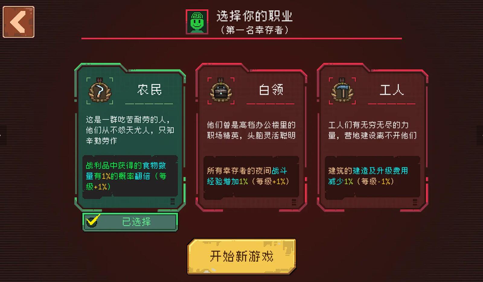 开局优先选择“工程师”、“农民”或“医生”职业,程师能加速建筑修复与陷阱制作,医生则提升治疗效率减少减员风险,而农民则可以在白天概率获取额外实物。首日务必安排工程师建造至少2座瞭望塔(覆盖营地东西两侧),医生需在日落前储备5份急救包。若随机到“侦察兵”职业,白天务必派遣其探索周边,标记资源点与特殊丧尸巢穴位置,为夜间防御提供警报。