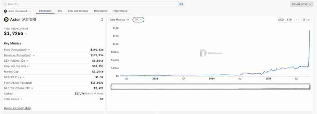 目前,Aster 的 FDV 约为 121 亿美元,协议交易量在短短一周内就达到了约 5320 亿美元——而 Hyperliquid 花了一整年才达到这一水平。截至本文撰写时,Aster 的总锁定价值 (TVL) 已超过 17 亿美元,过去 30 天的交易量达到 270 亿美元。