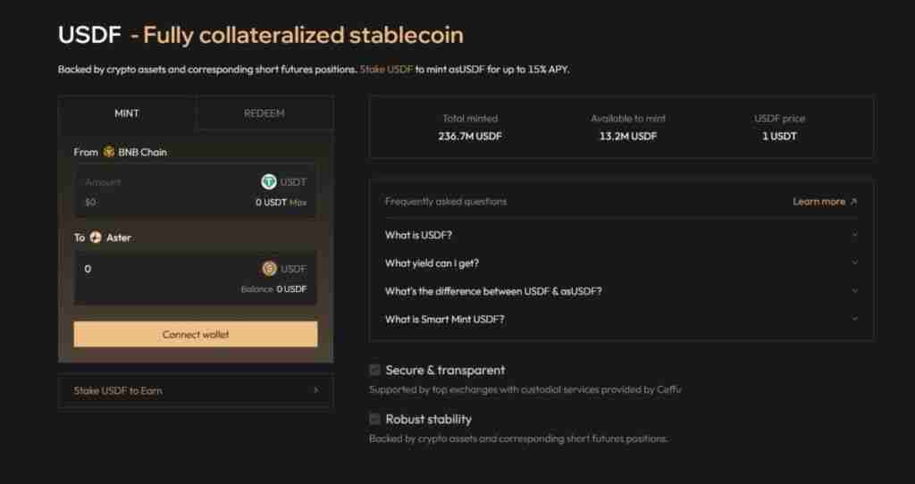 抵押:用户必须存入 USDT 或 BNB 等加密资产来铸造 USDF,USDF 被锁定作为支持。Delta 中性策略:为了最大限度地降低价格波动风险,Aster 部署了 Delta 中性仓位,确保挂钩稳定性,同时抓住套利和融资机会。收益产生:抵押品可以通过以下方式进一步部署:在 DeFi 协议中借贷或质押。捕捉 Perp DEX 上的正融资利率(例如,当融资为正时做空)。这种结构使 USDF 能够提供高达 15% 的年利率,同时仍然发挥稳定的、与美元挂钩的资产的作用。