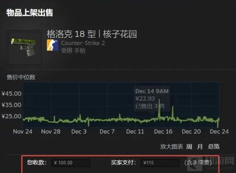 假设你在《CS2》或《DOTA2》中有一个饰品,你决定以100元的价格出售给其他玩家。根据15%的手续费,Steam会从中扣除15元。换句话说,买家支付的总金额将是115元,其中15元会作为手续费被Steam收取。作为卖家,你将实际收到的收入是100元。
