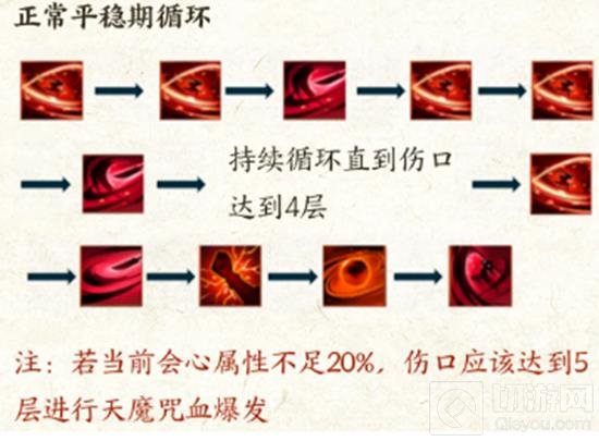 在伤口层数较高时,使用【沸血咒】吸取伤口层数,并释放【天魔咒血】以提高暴击率。