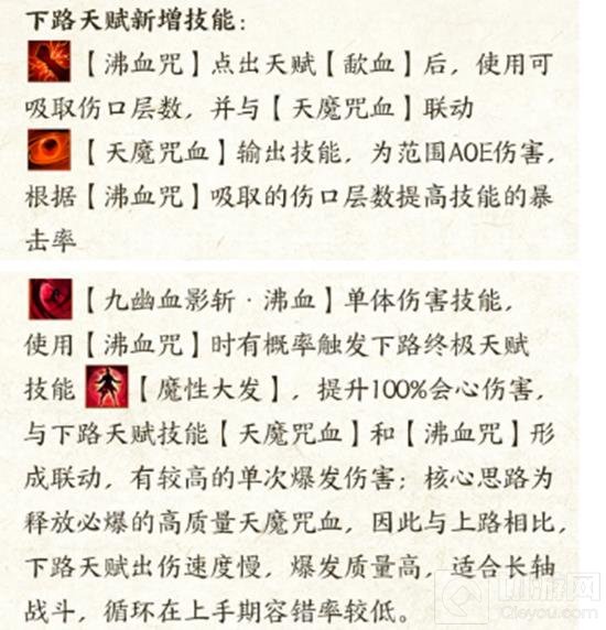 下路天赋的核心思路是释放必爆的高质量【天魔咒血】,因此与下路相比,下路天赋的出伤速度慢,但爆发质量高,适合长轴战斗。